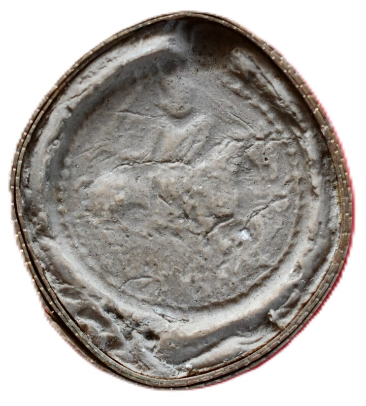 W polu pieczęci postać jadąca konno w lewo, odziana w szatę, być może narzuconą na zbroję, z mieczem wzniesionym sztychem ku górze w prawej ręce. Elementy wyobrażenia dzielą legendę.