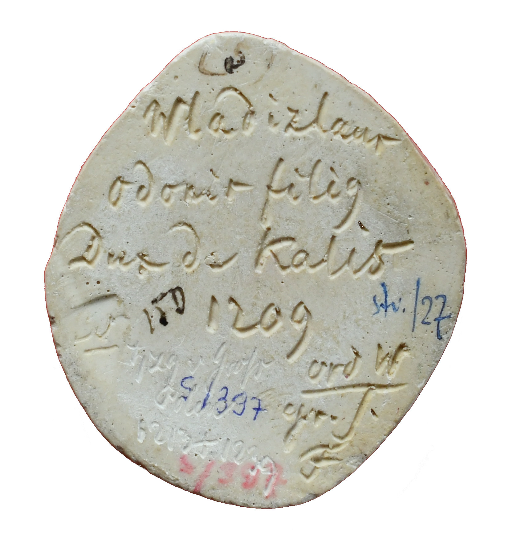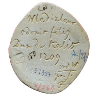 Na odwrocie napis wyryty: Wladislaz / Odonic filius / Dux de Kalis / 30 1209 / hzg v GroB / Polen / 1213 + 1239 / odr W\grs / F.
