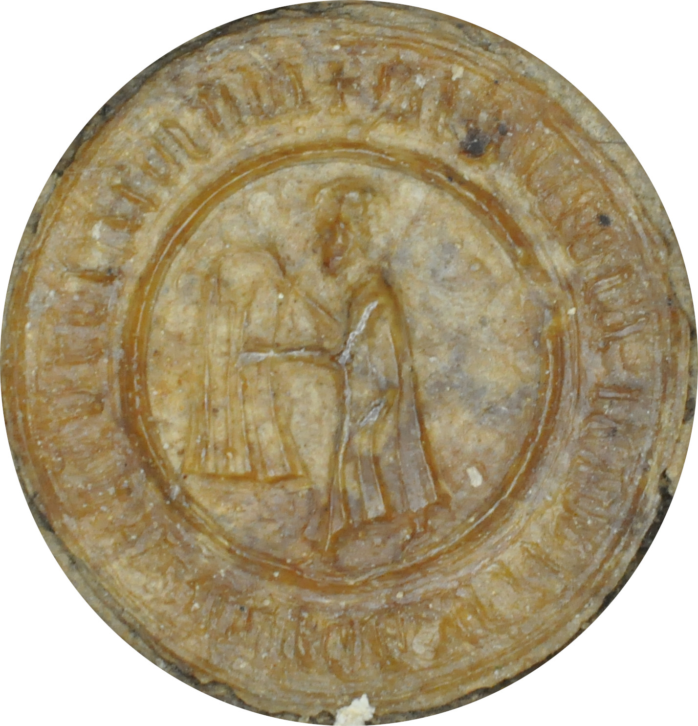 W polu pieczęci, otoczonym ornamentem arkadowym, zwrócona w prawo stojąca postać mężczyzny z brodą, odzianego w długi płaszcz, trzymającego w wyciągniętych rękach tunikę.