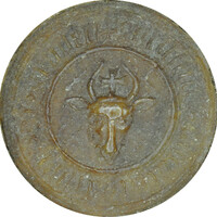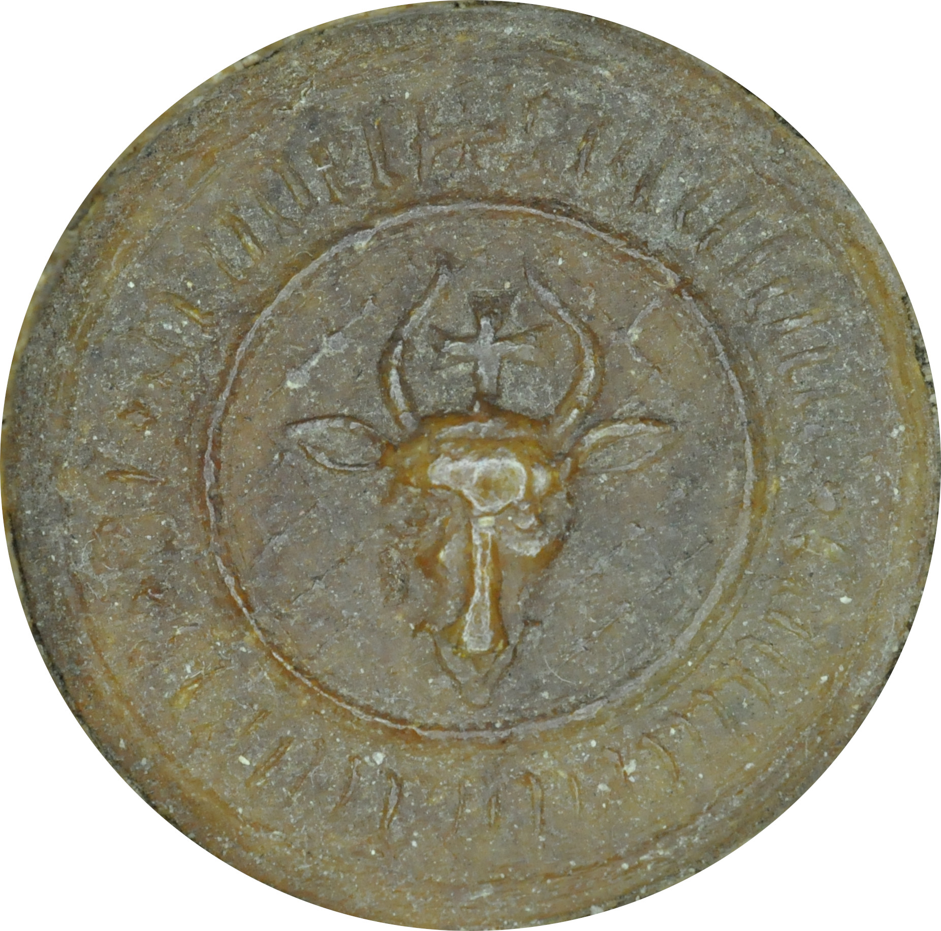 Okrągła; Ø 33 mm; wosk naturalny; przywieszona na niciach jedwabnych, czerwonych; legenda słabo odciśnięta, zatarta.