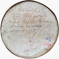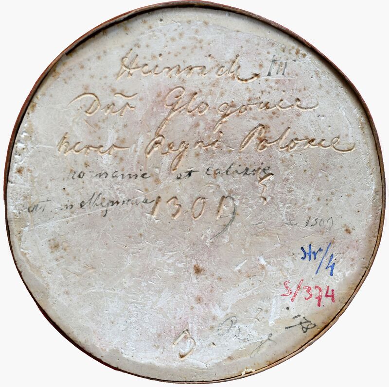 Napis wyryty na odwrociu odlewu: "Heinrich III - Dns Glogovie - Heres Regni Polonie 1301, napis atramentem: "Poznanie et Calizsie [...], 1309, Str/4, 178, 2, B, [...]