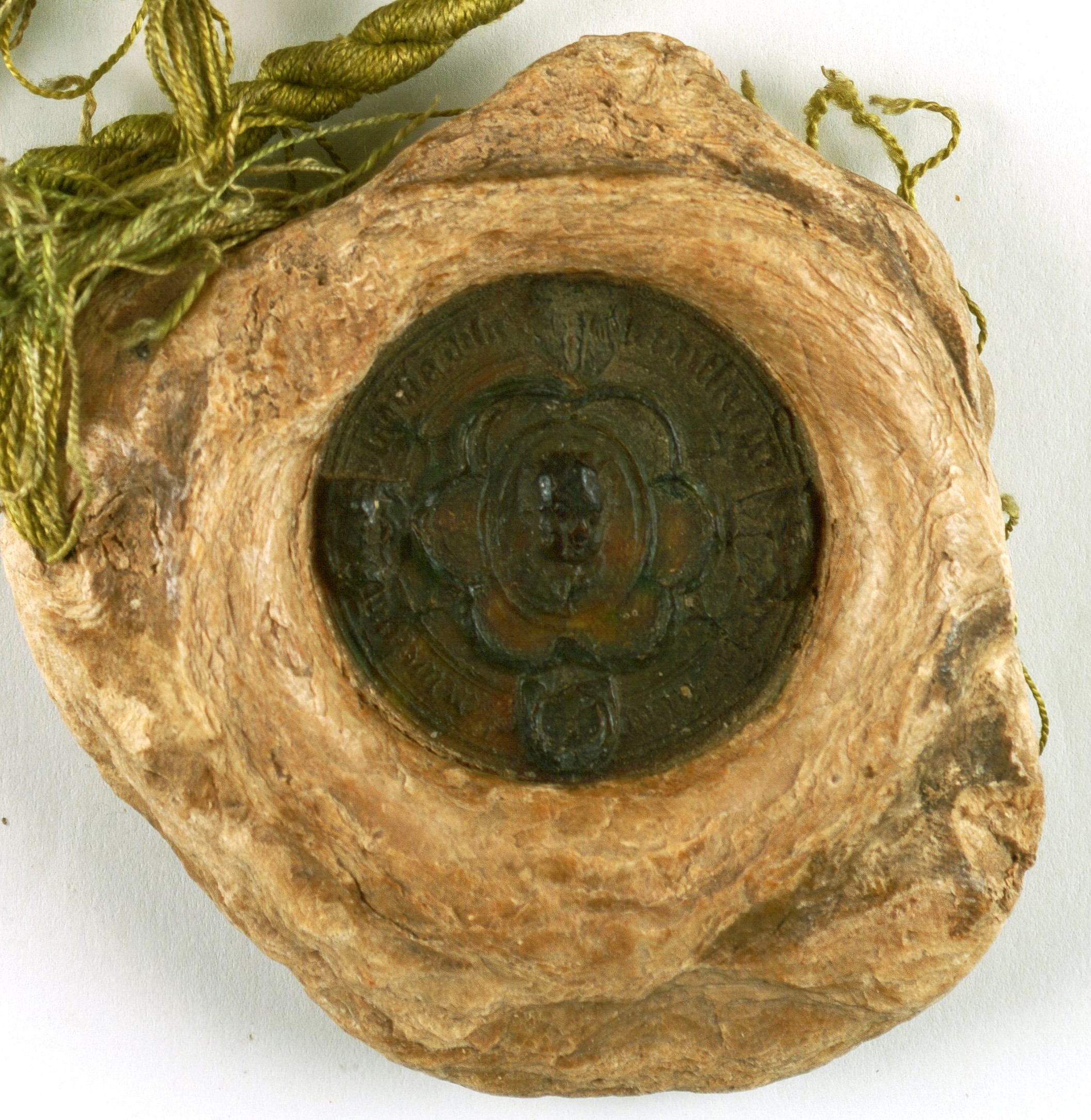 Legenda i tarcze herbowe miejscami niezbyt wyraźne. Miska pieczęci częściowo niezachowana.