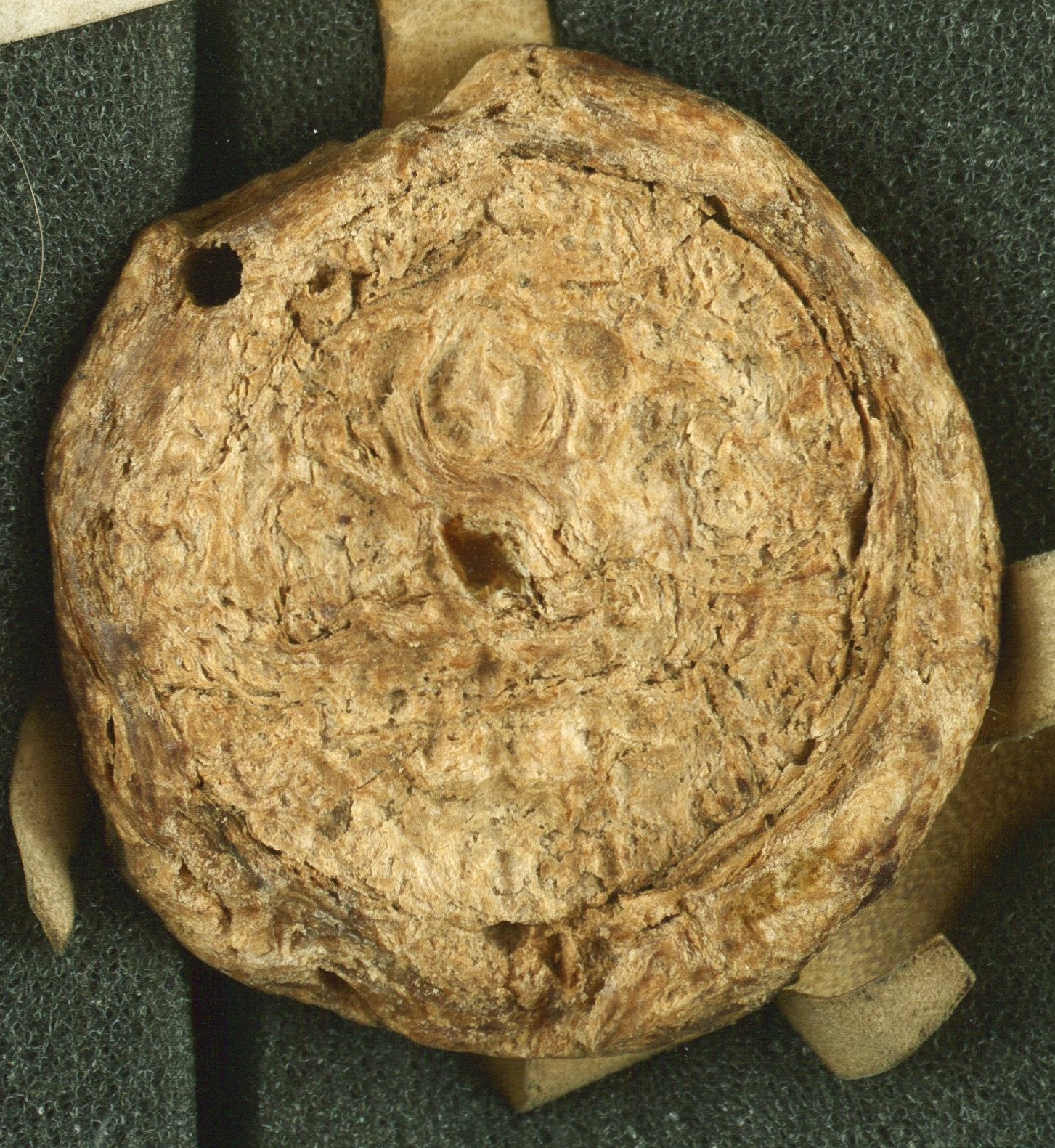 Odcisk kompletny, ale niemal w całości zatarty. Legenda nie do odczytania. Z wyobrażenia widać jedynie zarys trzynastołukowego obramienia oraz korony otwartej, z której wychodzą dwa bawole rogi. Miska pieczęci zachowana prawie w całości.