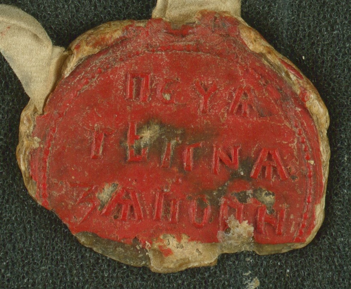 Korybut-Dymitr Olgierdowicz, książę [litewski], pieczęć napisowa [rewers dwustronnej pieczęci]. Odcisk z Archiwum Głównego Akt Dawnych w Warszawie z 1386 r.