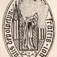 Stehender Abt unter gothischem Baldachin. Unten undeutliche Darstellung. Umschrift: