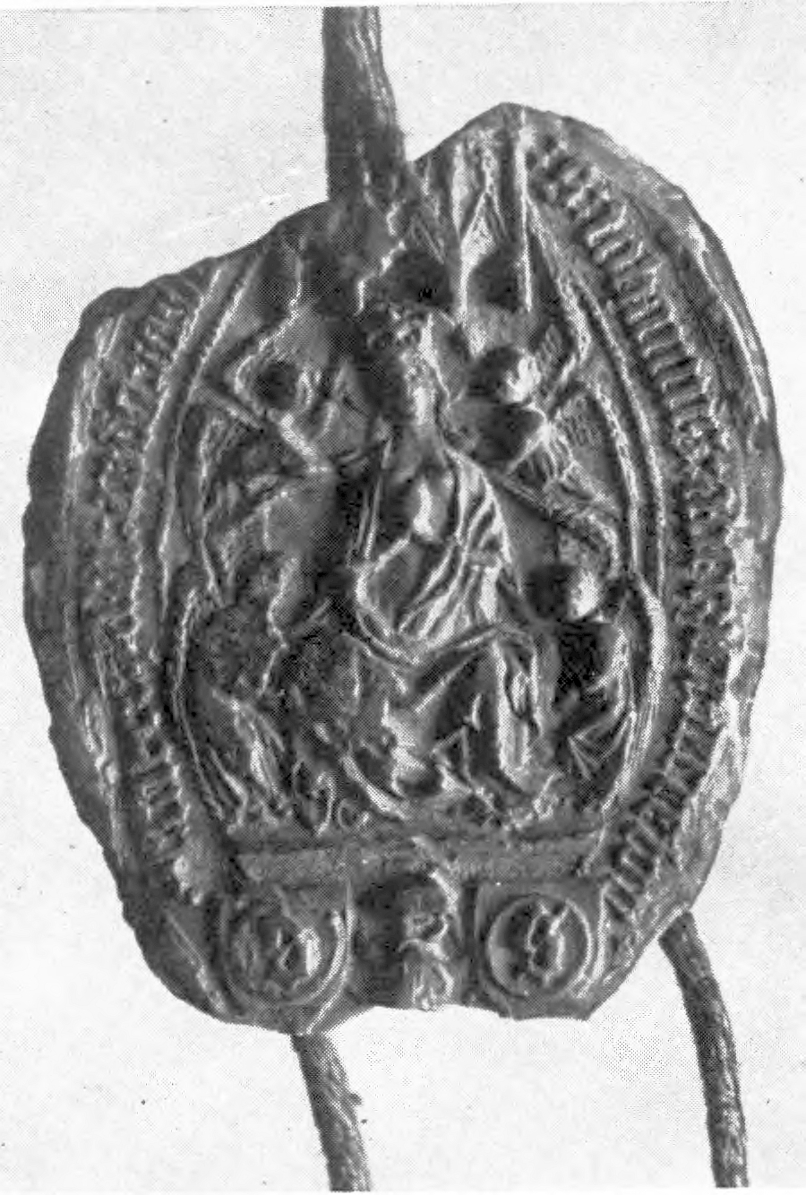 [Pieczęć] Jana Abeczir, kapelana papieskiego (fig. 539), z postacią tronującej N.P. Marii pod baldachimem architektonicznym, adorowanej przez czterech aniołów i z postacią klęczącego sygnatariusza w predelli pomiędzy tarczami herbowymi.