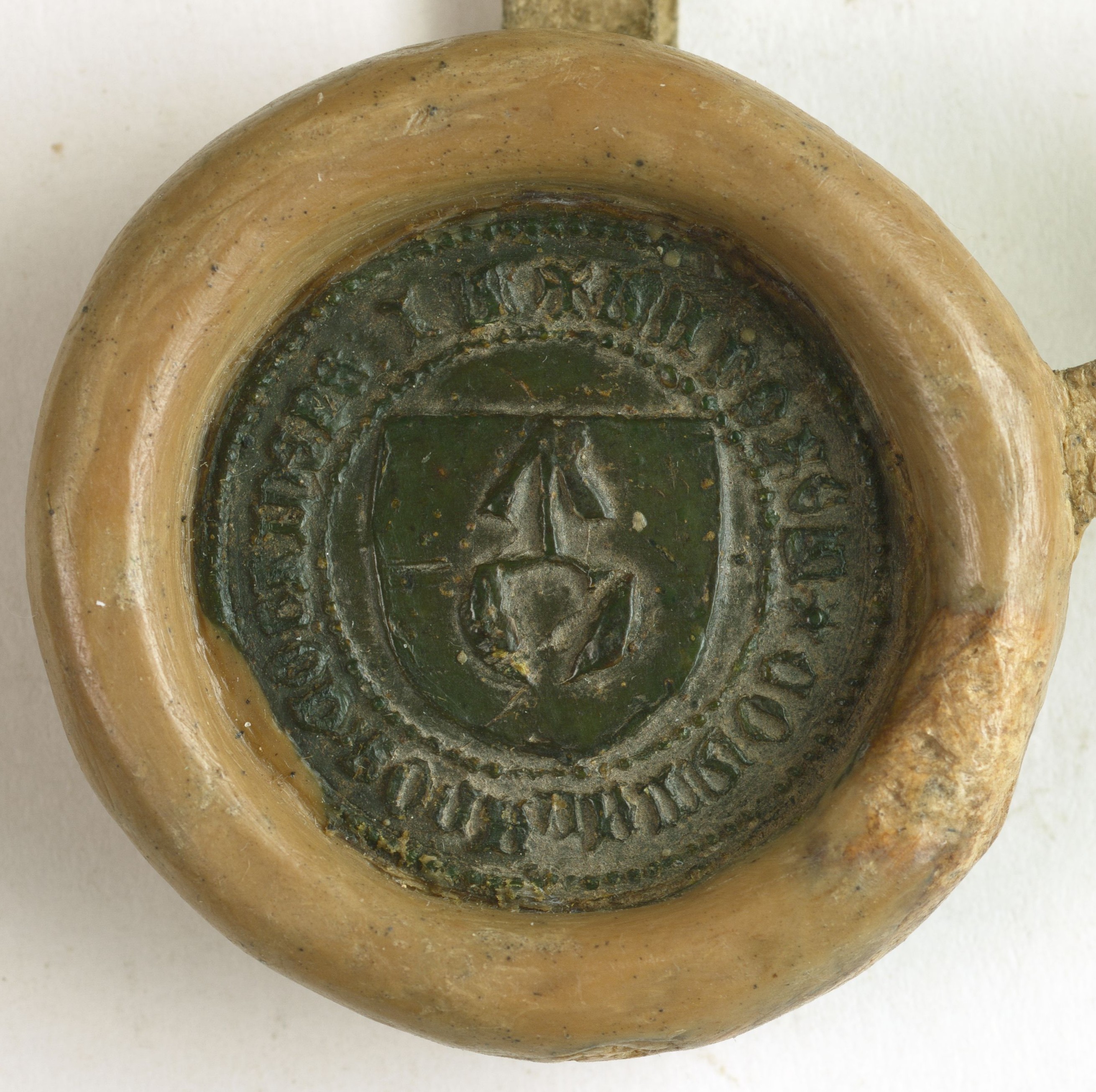 Miska pieczęci w większości niezachowana, współcześnie uzupełniona jasnym woskiem.
